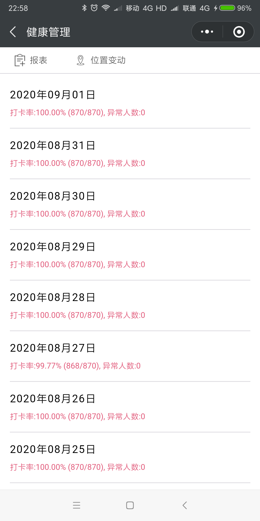 按照员工处要求,为准确掌握员工假期期间的动向及健康情况,公司员工管理科组织各年级班主任每天督促员工在微信小程序“我在校园”里健康打卡,重点关注身体情况异常的员工,落实异常员工及家人的实际情况,准确掌握异常员工每天早晚的体温并及时报备;对于未按时打卡的员工,督促班主任电话跟踪,及时了解员工及家人的具体情况,以保证每天准确掌握各年级各班员工的实际情况;关注并了解员工近14天行程,为开学返校做好充足准备。(文/图 王靖晶)