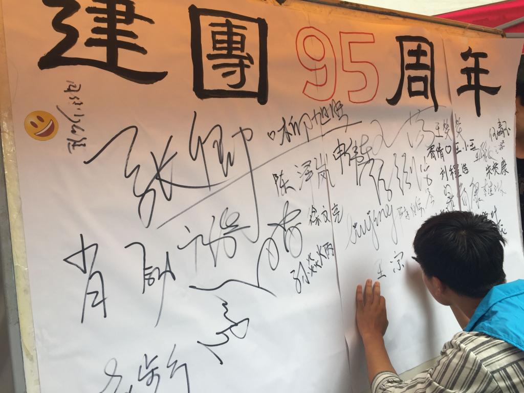 现场精美的宣传展板吸引了同学们的目光,在工作人员的带领下,大家重温了团史和团章,了解了做一名合格团员的内容和要求。随后,同学们纷纷在展板上签字留念和与团旗合影。