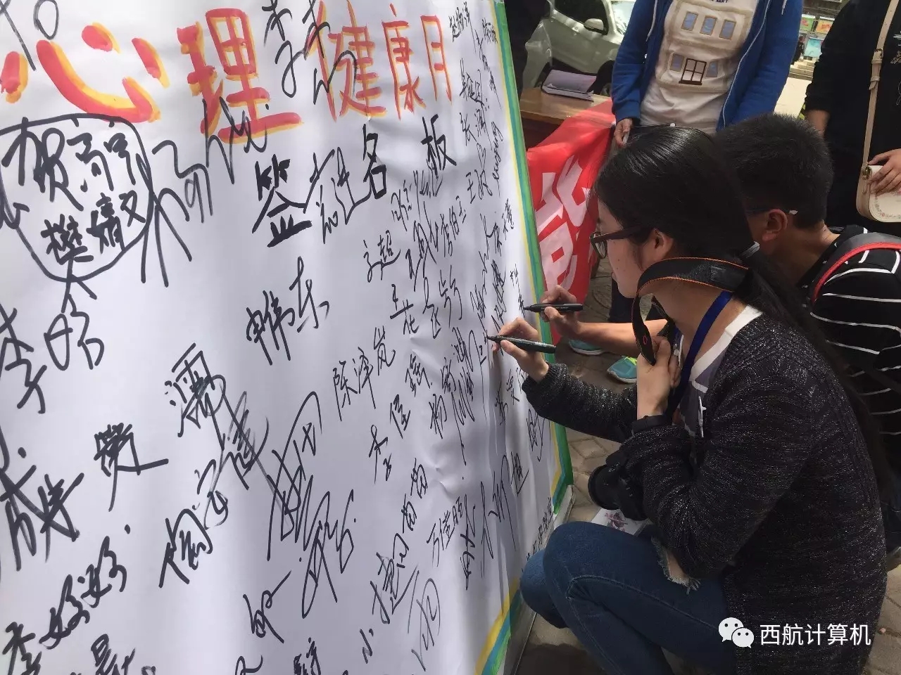 伴着悠扬的歌曲,工作人员装扮成玩偶与同学们互动,向大家宣传心理健康知识,现场的气氛活跃而轻松。通过讲解和学习,同学们更加深刻地了解了心理健康的重要性,学会了如何调节心态,以积极向上的态度面对生活。之后,参加活动的同学纷纷在宣传板上签名,表达了自己对老员工心理健康活动的支持。同学们表示,通过此次主题活动学会了如何去面对自身的不足,关心爱护身边的人,以更饱满的活力去学习和生活。