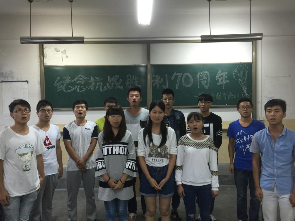 在对抗日战争有了更全面深刻的认识后,各班围绕抗日战争胜利开展合唱、演讲、朗诵、讨论等庆祝活动,从不同的角度表达了对抗日战争胜利70周年的纪念。辅导员米嘉琪老师希望大家珍惜来之不易的和平环境,热爱生活,同时在9·18来临之际做好安全防范工作,严格遵守校规校纪。