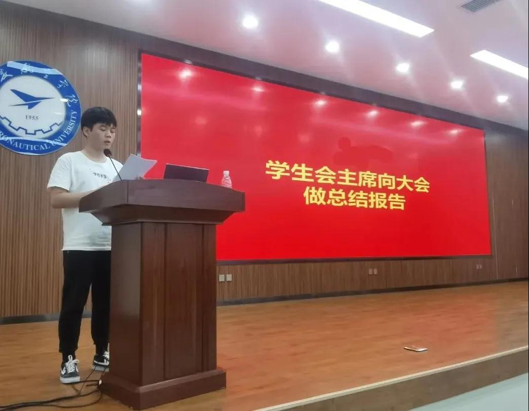 大会第二项,团总支员工会主席秦征同学向大会做《百年正青春 砥砺谱新篇--用青春书写团学华章》的2020-2021学年团总支员工会工作报告。主席团成员,各部部长就2020-2021学年工作向大会进行述职。