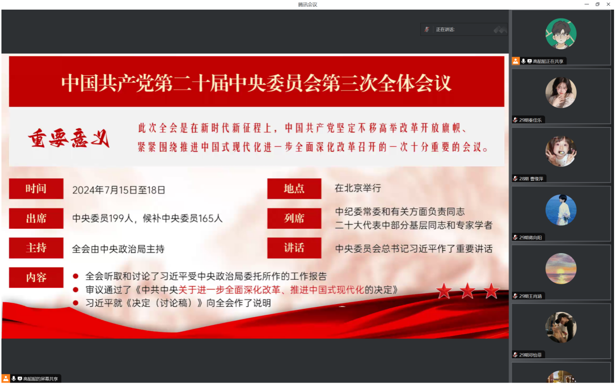 通过此次学习,大家对党的二十届三中全会的重大意义、丰富内涵以及全面深化改革的目标任务有了更清晰的认识。大家一致表示,党的二十届三中全会是在以中国式现代化全面推进强国建设、民族复兴伟业的关键时期召开的一次十分重要的会议,充分彰显了以习近平同志为核心的党中央坚定不移将改革进行到底的历史主动精神、巨大政治勇气和强烈责任担当。下一步,全院学子将持续深入学习领会全会精神,凝心聚力、奋发进取,为不断推动公司高质量发展汇聚青春力量,为中国式现代化挺膺担当。(文/徐夕然、张佳乐 图/秦佳乐)